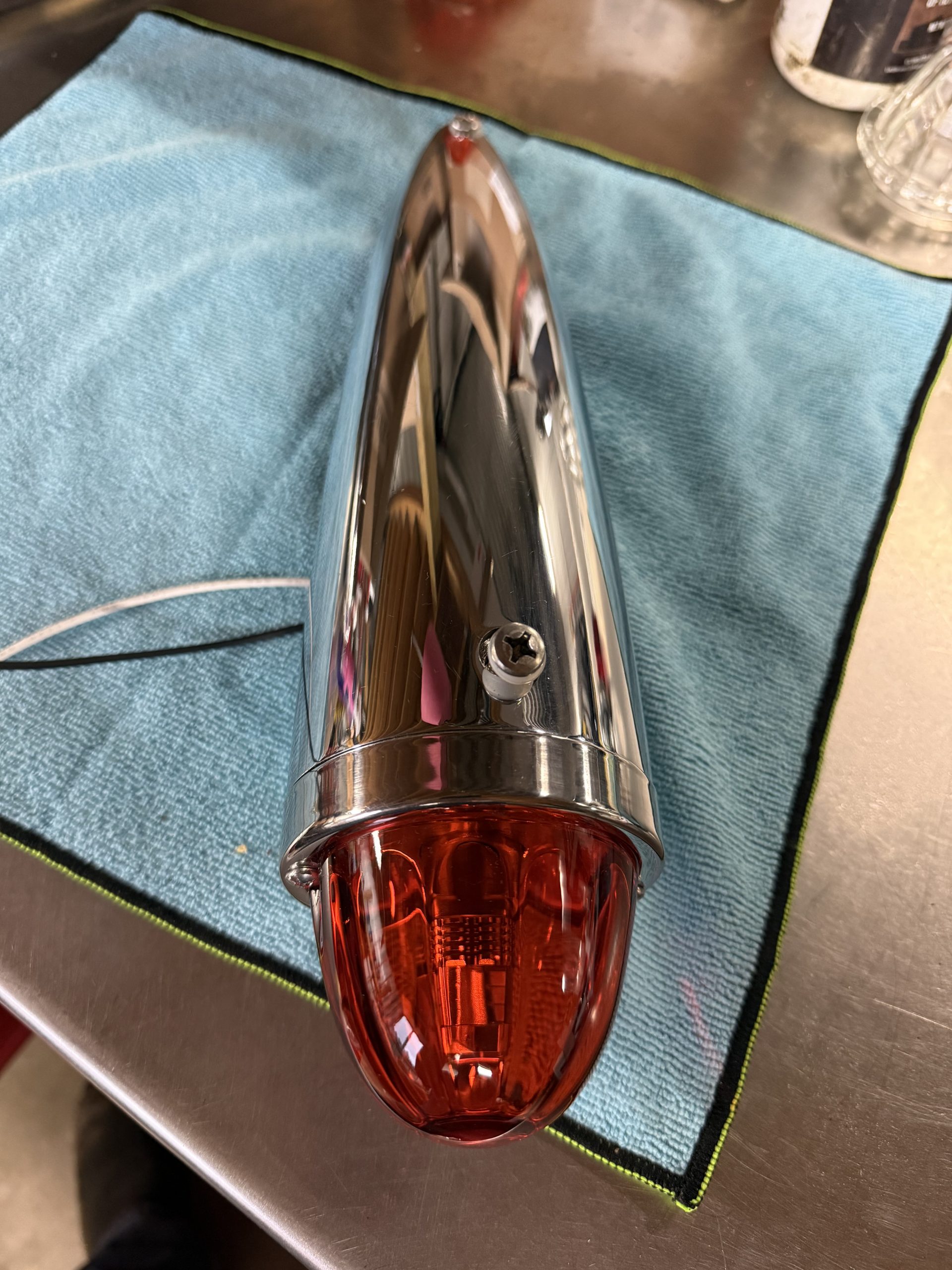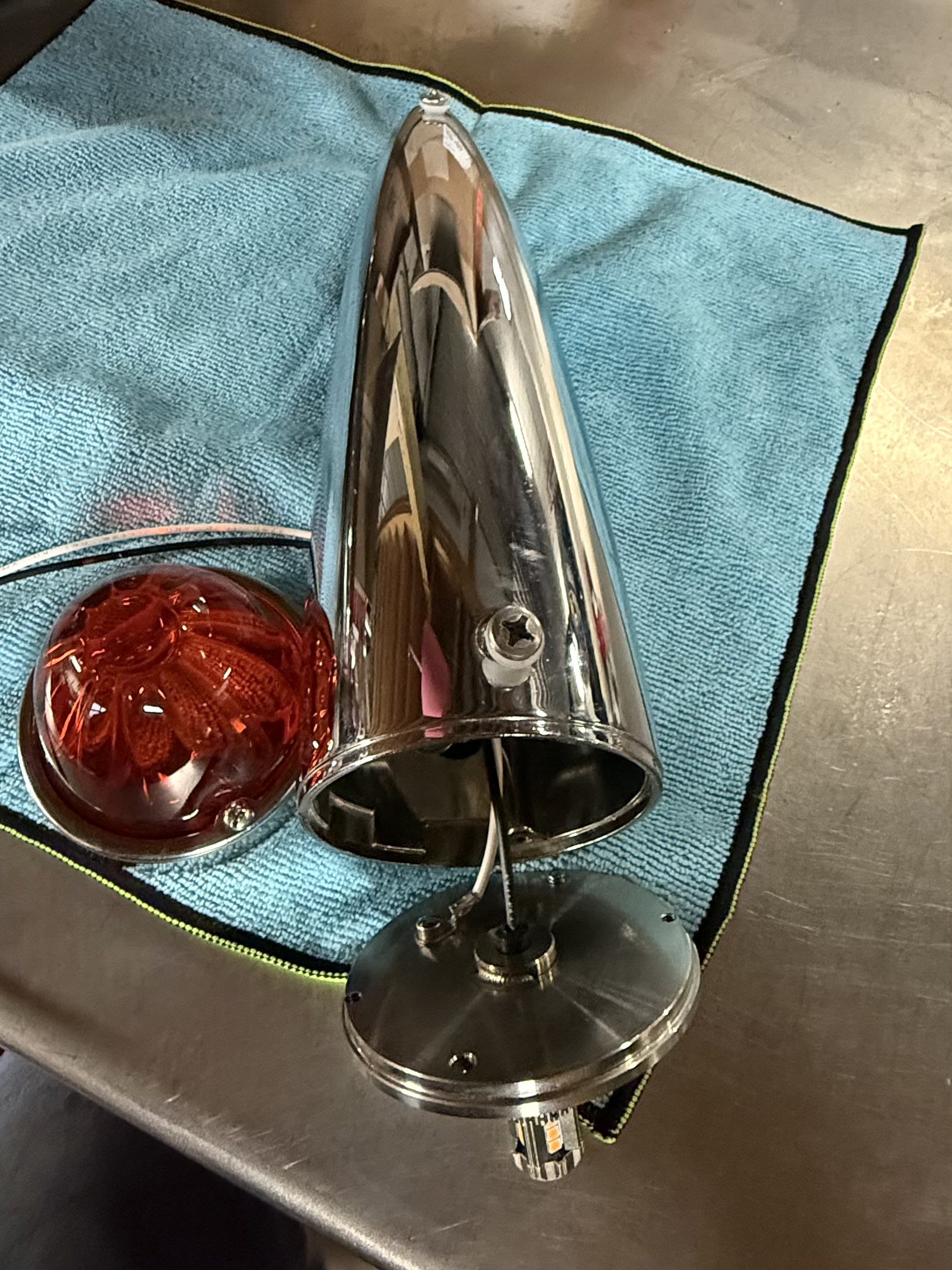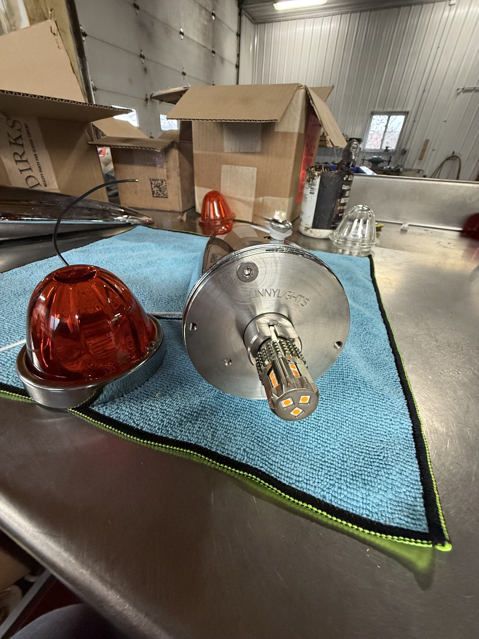 Complete diecast roof light with all stainless machined insert. Comes complete with led bulb. ready to wire in and bolt on. Glass watermelon lens. Uses a 1156 bulb.  Grand General housing